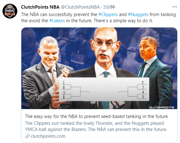 美媒ClutchPoints NBA发推写道:NBA可以预防快船和掘金故意避开湖人,有一种简单的方法可以做到这一点。