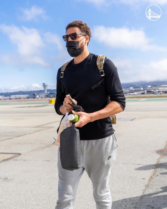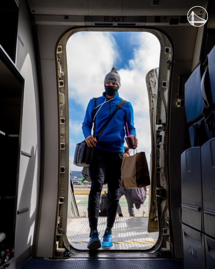 库里背着两个包——斜跨一个和单肩一个,手里提着一个袋子,还拿着一杯粉色的饮料(和此前哈登坐场边喝得类似);库里身穿蓝色运动外套和黑色长裤以及蓝色球鞋,戴着一顶针织帽,走进机舱。