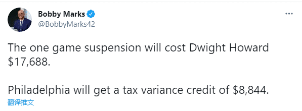 由于被禁赛一场,霍华德将无缘出战今天与魔术的比赛,据薪资专家Bobby Marks报道,霍华德被禁赛一场损失17688美元,这样的话费城可以省下8844美元的税;再加上霍华德16次技犯累计要交2.5万美元的罚款,他总共损失42688美元,约4.3万美元。