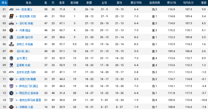 还有第11的鹈鹕和第12名的国王,战绩相同,都只剩2场,所以名次还没确定。第13的森林狼领先第14的雷霆1个胜场,排名也没有确定。所以说西部的格局到了这最后阶段依旧扑朔迷离,确实很刺激。
