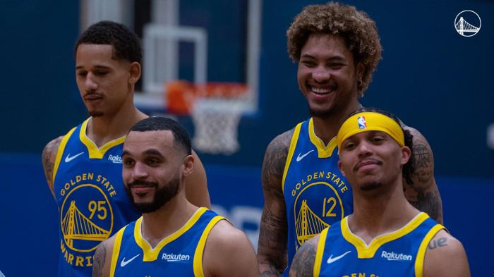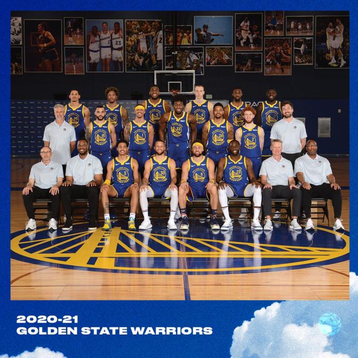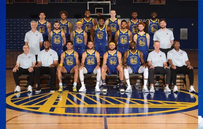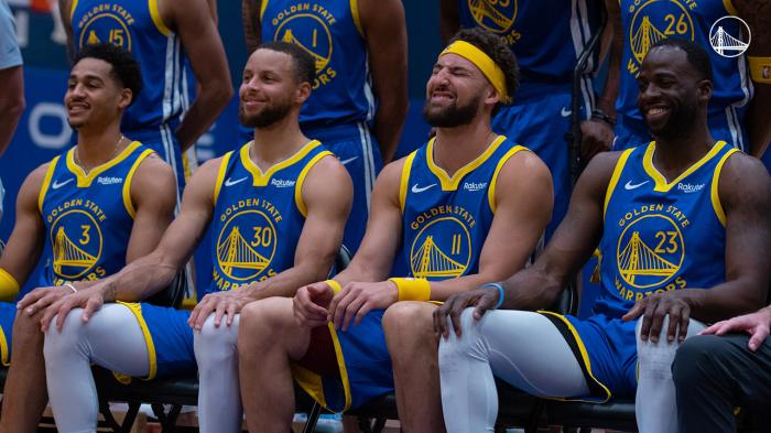 勇士官方晒全队合影!库里克莱C位领衔,汤神搞怪+榜眼拄拐太抢镜