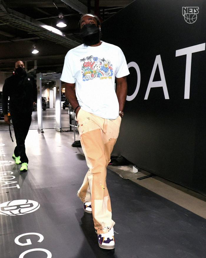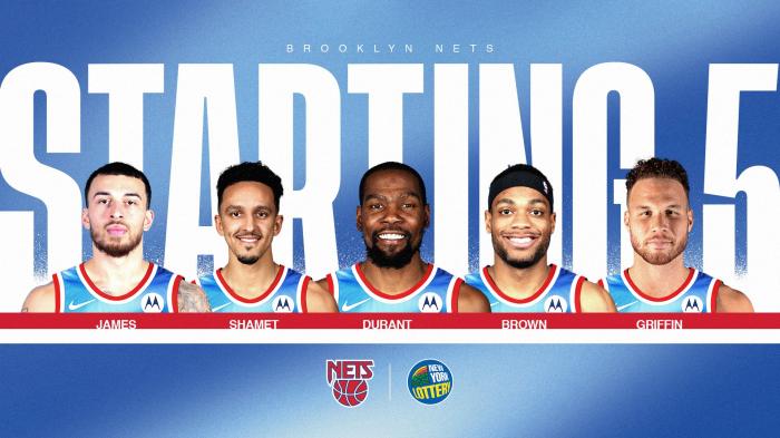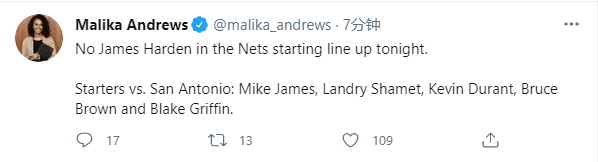 哈登替补上场,篮网首发阵容是迈克-詹姆斯、沙梅特、杜兰特、布朗和格里芬,这是篮网本赛季第36套首发阵容;篮网又是这样的操作,核心球星长期伤停,复出就是替补上场。