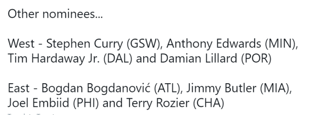 NBA还公布了获得周最佳提名的其他球员——