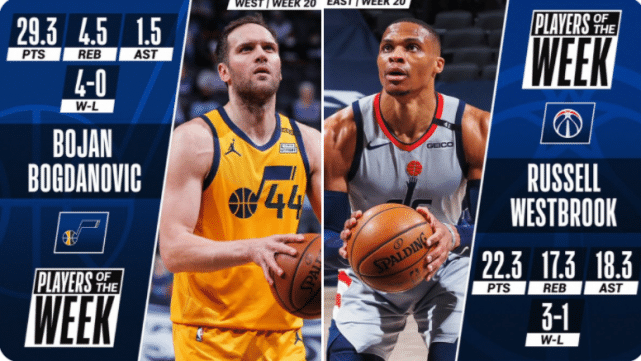 来源:24直播网05-11 10:2924直播网讯讯 北京时间5月11日,NBA官方宣布了上周的周最佳球员。东部周最佳属于奇才后卫拉塞尔-韦斯布鲁克,西部周最佳则由爵士前锋博扬-博格达诺维奇当选。