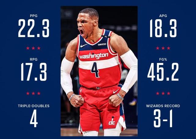 过去一周,韦斯布鲁克场均贡献22.3分18.3助攻17.3篮板,帮助奇才取得3胜1负的战绩。韦斯布鲁克成为NBA历史上第一位在4场比赛里场均贡献至少22分18助攻17篮板的球员。