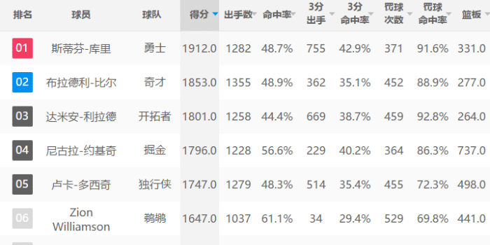 来源:24直播网05-11 09:4824直播网讯讯 NBA常规赛行将结束,单项数据王只剩下得分王还有悬念,抢断王属于巴特勒、盖帽王特纳、篮板王卡佩拉,得分王竞争者是比尔和库里,不过目前的情况出现了微妙的变化,比尔受伤了,而库里保持健康,同时他们所在的球队都只剩下4场比赛。比尔目前出战59场,总分1853分,场均得到31.4067分;库里目前出战60场,总分1912分,场均31.8666分。