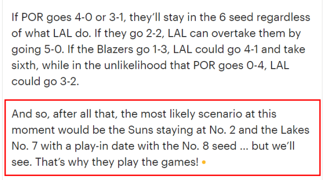 通过这番解析,Mike Trudell指出,最可能出现的情况还是太阳留在西部第2,湖人以第7的排名进入附加赛,与第8争夺季后赛名额。湖人若胜出,大概率季后赛首轮碰太阳;湖人若失利,还有机会和第9、第10的胜者竞争另一个季后赛席位。