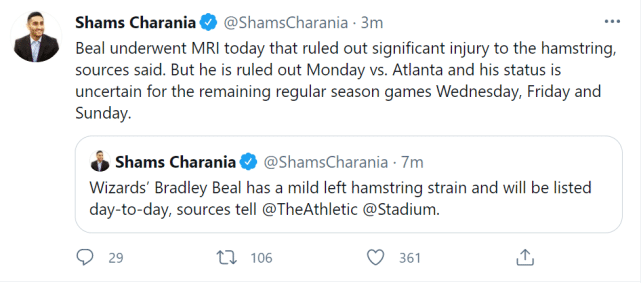 对于比尔来说,目前安心静养是最佳选择,毕竟,奇才32胜36负,排名东部第九,已经领先排名第11位的公牛3.5个胜场,相当安全。他们的最重要目标是通过附加赛获得一张季后赛入场券。奇才还有机会争取第八的位置,但无论排名第几,他们都需要健康的比尔。休战一场,每日观察,是奇才官方的计划。
