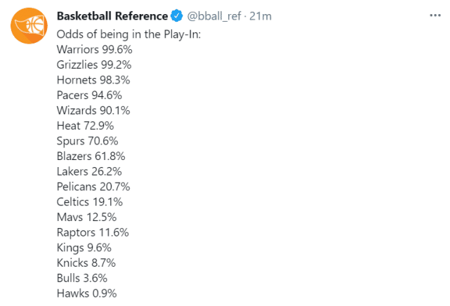 来源:24直播网05-07 15:1024直播网讯讯 北京时间5月7日,知名数据网站Basketball-Reference公布了2021年NBA球队参加附加赛的概率,17支球队出现在榜单上。参加附加赛概率最大的球队是勇士,达到99.6%,几乎是锁定了附加赛的其中一个名额。目前排在西部第六的湖人,在榜单上位列第九,他们有26.2%的概率打附加赛。