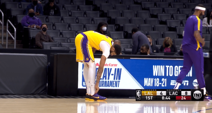 比赛刚开打没多久,浓眉和库兹马撞在一起,两人都倒地;首节8分44秒,湖人即将24秒进攻违例,浓眉干拔跳投三分,这球明显偏离篮筐;浓眉落地后向后退了几步,不幸踩到场边广告牌,右脚崴了一下,随后浓眉捂着脚踝十分痛苦,沃格尔第一时间走到浓眉身旁,十分担忧浓眉。