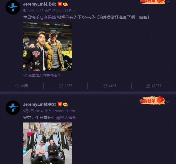 林书豪在国内有很多的明星好友,他近日在社交媒体上连续发文送出祝福,祝贺陈建州和李易峰生日快乐,也都得到了对方的回应。林书豪和他们的关系也都很好,一起打球和录制综艺节目,关系很密切。
