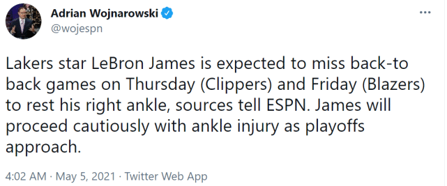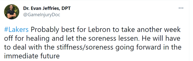 就像沃纳罗斯基报道的那样,詹姆斯必须更加谨慎,因为随着季后赛的临近,他不能再出差错。踝伤可能会在本赛季余下的比赛中继续困扰詹姆斯,但他也愿意在更重要的比赛中带伤出战。医学专家Evan Jeffries转发沃纳罗斯基的报道时,也写道:“对于詹姆斯来说,最好的选择是再休息一周,让酸痛感减轻。酸痛和僵硬,是未来一段时间他不得不面对的。”
