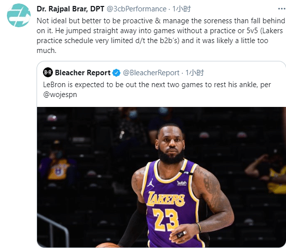 赛季至今,詹姆斯为湖人出战43场比赛,场均上场33.7分钟能够拿到25分7.9篮板7.8助攻,复出后遭受伤病的困扰,目前在湖人每日观察名单上,只是脚踝酸痛,没有出现反复的情况。