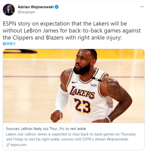 来源:24直播网05-05 20:1224直播网讯讯北京时间5月5日,ESPN名记沃纳罗斯基报道,预计詹姆斯将会因右脚踝伤势再缺席两场比赛,缺席对阵快船和开拓者的背靠背比赛,从而继续休养右脚踝;名记还表示随着季后赛临近,湖人谨慎对待詹姆斯的脚踝伤病,甚至爆料詹姆斯可能会缺席更多的比赛。