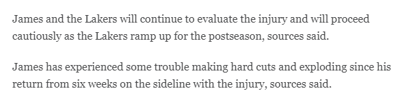 詹姆斯复出之后仅仅打了两场比赛,对阵猛龙时因伤提前退出比赛,缺席了与掘金的比赛;现在詹姆斯至少再伤停两场,究竟他复出后最大困扰是什么?名记透露,在受伤休战6周复出后,詹姆斯在做一些需要爆发力的动作和发力空切时感到一些困难。
