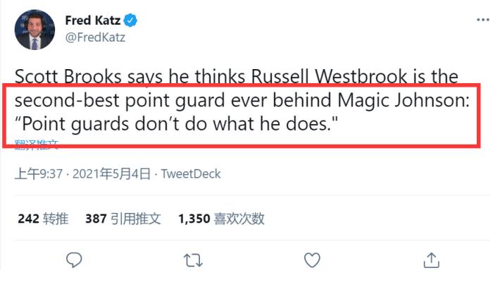 奇才主帅布鲁克斯赛后也忍不住盛赞韦少,认为他是历史上仅次于魔术师约翰逊的控卫!“控卫打不出他这样的表现。”布鲁克斯说道。虽然这番言论可能有些争议,但不得不承认的是,韦少的确刷新了人们对控卫的认知,一个身高只有接近1米9的控卫能4个赛季打出场均三双,放在以前,人们根本不相信这会发生。