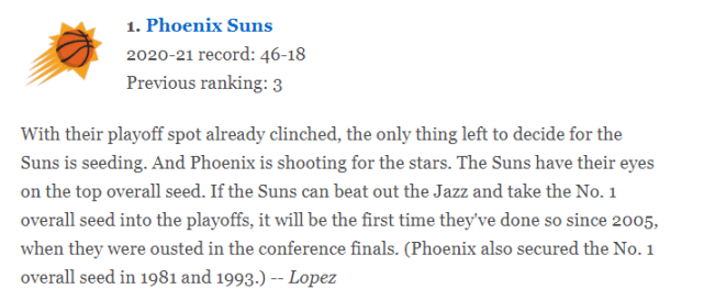 在ESPN实力榜上,太阳从上周的第三升至本周的第一。他们已经锁定季后赛名额,接下来的目标就是联盟战绩第一的宝座。如果太阳能力压爵士成为西部头号种子,那将是他们2005年以来的第一次,此外,太阳在1981年和1993年还分别做到过。