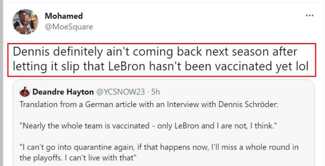 有球迷认为,这件事可能会影响到施罗德未来留队的前景。一个球迷转发施罗德的言论后写道:“在泄露詹姆斯没有接种疫苗后,丹尼斯(施罗德)下赛季肯定回不来了。”