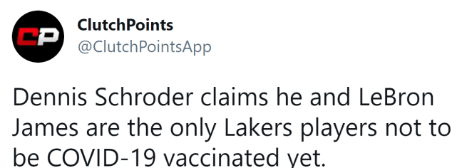 “几乎全队都接种疫苗了,我认为只有我和勒布朗(詹姆斯)没有这么做……我不能再被隔离了。如果这真的发生了,我可能要错过一整轮系列赛,我承受不起这种情况。”施罗德在采访中说道。