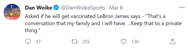 3月初,曾有记者询问詹姆斯是否接种疫苗,詹姆斯当时的回应是:“那是我会和家人讨论的话题……这涉及隐私。”如今,施罗德在采访中却泄露了他的隐私。