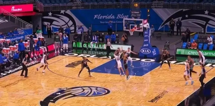 比赛最后7秒,魔术落后2分,科尔-安东尼边线开球,给到队友做个手递手接回球权,面对大锤的防守一记超大幅度变向后,撤出三分线顶着防守高难度投篮命中反超1分。