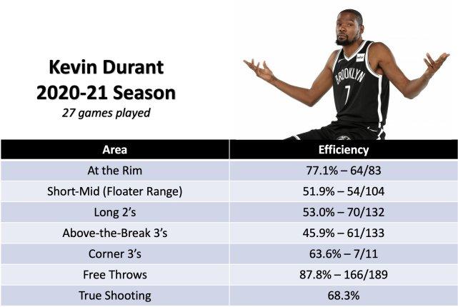 杨的统计显示,赛季至今,杜兰特篮下命中率77.1%,近距离至中距离命中率51.9%,长两分命中率53%,非底角三分命中率45.9%,底角三分命中率63.6%,罚球命中率87.8%,真实命中率68.3%。