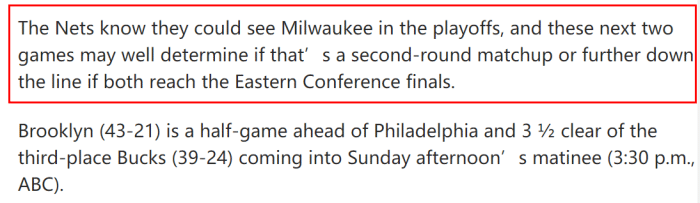 篮网接下来的两场比赛,将连续在客场对阵雄鹿。《纽约邮报》指出,两队有望在季后赛相遇,暂不确定是第二轮还是东部决赛。这两场球,有可能是东决预演。目前,篮网战绩是43胜21负,只领先费城0.5个胜场,领先雄鹿3.5个胜场。