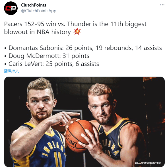步行者创造本赛季最大赢球分差,换句话说,这也是本赛季最大惨案;此前勇士曾惨败猛龙53分,如今旨在摆烂的雷霆狂输57分;小萨复出首战轰下超级三双,半场20+三双成为NBA近25年第一人,步行者创造队史第二大赢球分差,这也是NBA历史第11大惨案,目前历史常规赛最大惨案是骑士保持的狂赢68分。