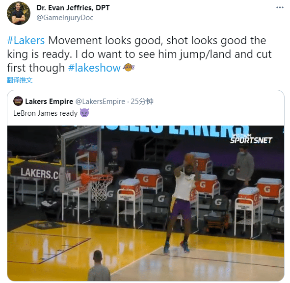 医学专家转发詹姆斯热身视频,发推写道:动作看起来不错,投篮看起来也不错,国王准备好了。