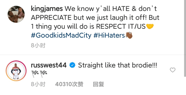 来源:24直播网04-30 17:4524直播网讯讯北京时间4月30日,湖人球星勒布朗-詹姆斯更新社媒,晒出自己与奇才球星韦斯布鲁克在比赛中的一张合影,两人有说有笑。詹姆斯配文写道:“我们知道你们都在讨厌&并不欣赏,但我们只是一笑而过!你们要做的唯一一件事就是表达尊重#好孩子疯狂城市#你好黑子们。”韦少也第一时间回复:“说得太对了,兄弟!”