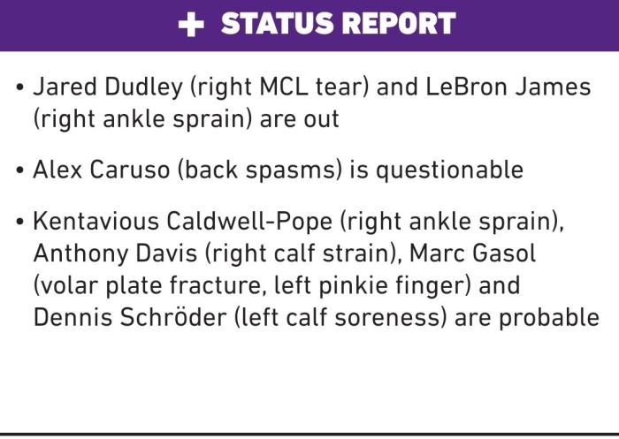 来源:24直播网04-30 11:5324直播网讯讯 北京时间4月30日,洛杉矶湖人公布下一场对阵国王的伤病报告,勒布朗-詹姆斯因脚踝扭伤继续休战,卡鲁索被列为出战成疑,浓眉(小腿拉伤)、波普(脚踝扭伤)、小加索尔(手指骨折)和施罗德(小腿酸痛)都是大概率出战。