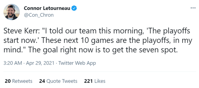 “今天上午, 我对我们的球员说‘季后赛现在已经开始了’在我心里,接下来的10场比赛,就是季后赛。现在的目标是拿到西部第七的排位。”科尔说道。