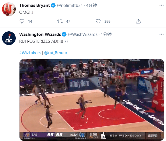 八村塁隔扣浓眉瞬间引热议,奇才官方第一时间晒出这一幕,发推写道:八村塁海报式隔扣浓眉;托马斯-布莱恩特为队友欢呼,发推写道:我的天呐。