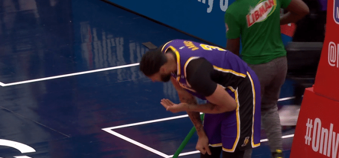 第三节8分52秒,奇才反动反击快攻,比尔第一时间把球传给疯狂快下的八村塁,八村塁接球后直接攻击篮筐,无惧浓眉直接上演残忍隔扣,直接扣倒浓眉;浓眉惨遭隔扣沦为背景板,貌似还没打到嘴巴,倒地之后捂着嘴巴十分痛苦。