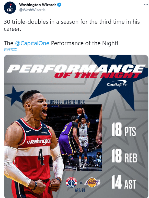 奇才官方狂吹韦少,发推写道:韦少第三次单赛季轰下30+三双,此前在17年和19年,韦少也曾单赛季至少30次三双,韦少成为NBA历史第一位多次单赛季30+三双的球员,NBA上古大神张伯伦和大O都是一次做到。