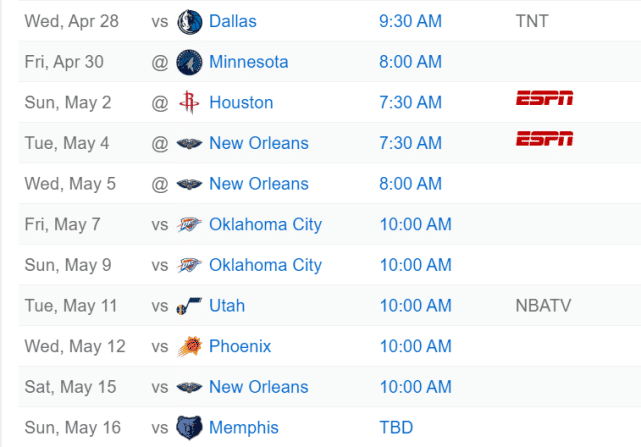 随后,勇士将连打4个客场,但对手依次是森林狼、火箭和鹈鹕(两次)。最后6场比赛,全部是主场,对手依次是雷霆(两次)、爵士、太阳、鹈鹕和灰熊。其中,爵士和太阳虽然实力更强,但他们为了备战季后赛,届时有可能选择轮休主力。因此,勇士在最后11场比赛里获得高胜率的可能比较大。相比之下,开拓者状态糟糕,灰熊和马刺的赛程更艰辛。