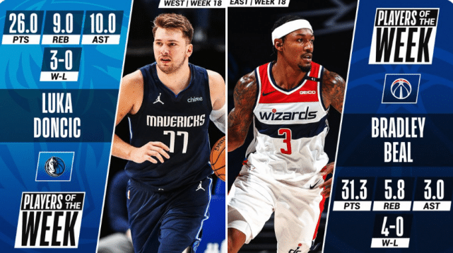 来源:24直播网04-27 15:2224直播网讯讯 北京时间4月27日,NBA官方公布了上周东西部周最佳球员。东部周最佳属于奇才后卫布拉德利-比尔,而西部周最佳属于独行侠后卫卢卡-东契奇。勇士队的库里虽然也有出色的表现,但无缘蝉联这一奖项。