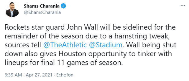 来源:24直播网04-27 15:2124直播网讯讯 北京时间4月27日,据名记查拉尼亚报道,火箭后卫约翰-沃尔因腿筋拉伤将缺席本赛季余下的所有比赛。火箭已经提前无缘季后赛,沃尔这时候被安排“赛季报销”,显然也是球队为了试验新阵容,当然,也得继续摆烂,确保能以倒数前三的成绩结束本赛季。随后,名记麦克马洪跟进报道,沃尔遭遇腿筋二级拉伤。