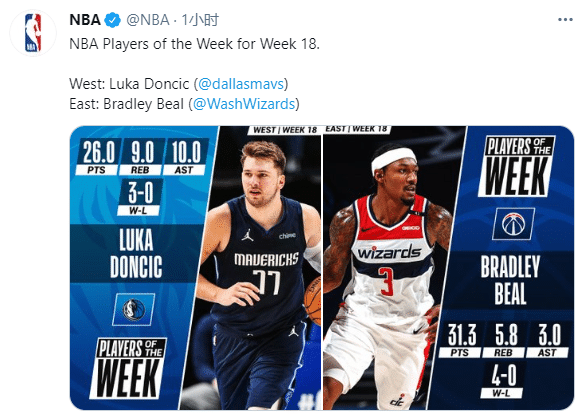 上周比尔场均轰下31.3分5.8篮板3助攻,三分命中率高达55.0%,带领奇才四战全胜;这是比尔本赛季首次获得东部周最佳,职业生涯第四次当选,比尔上一次获得周最佳已是两年前的事了;东部周最佳悬念不大,但西部有争议,东契奇上周场均26分10助攻9篮板,带领独行侠3胜0负,勇士领袖库里遗憾落选。