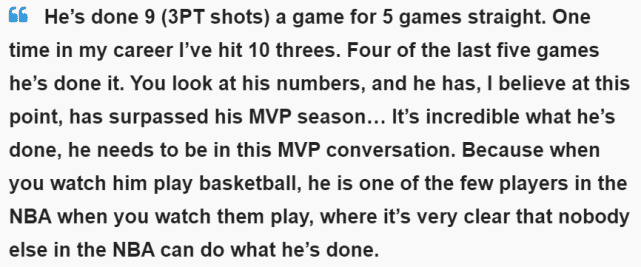 热火神射邓肯-罗宾逊,更是直言库里的表现已经超越了MVP赛季。“他几乎连着5场投进至少9个三分吧,在我职业生涯里,只有一场比赛投中10个三分,但他在5场比赛里有4场做到了,”邓肯-罗宾逊在自己的播客节目上说道,“看看他的数据,我觉得他现在的表现已经比他的MVP赛季更强……他所做的事是难以置信的,他应该进入MVP的讨论范围。因为当你看他打球的时候,你会觉得NBA里的其他人做不到他能做的事,这是很少见的。”