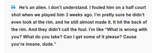 “他(库里)就是个外星人,我搞不懂。3周前,我们和他交手,当时他有一个半场附近的投篮,我都对他犯规了,我相当确定他当时根本就没看篮筐,但他仍然差点给投进去了。裁判没有吹那个犯规。”霍勒迪说,“我那时的想法就是‘没搞错吧?你吃的是什么啊?我能不能也吃点,因为兄弟你真是太疯狂了。’”