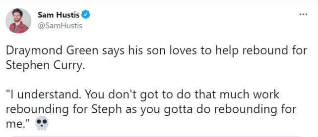 战胜掘金这场比赛后,队友格林也夸赞了库里的投射能力。他说:“我儿子很喜欢斯蒂芬(库里),他来训练馆的时候,最喜欢做的事就是去给斯蒂芬捡球。我明白,给斯蒂芬捡球很轻松,比给我捡球轻松多了。有一天,其他人在另外一边投篮,我跟儿子说‘你想去帮忙吗?’,他说不,我想去帮斯蒂芬捡球。真是个聪明的小孩,给库里捡球,站在篮下就行了。”