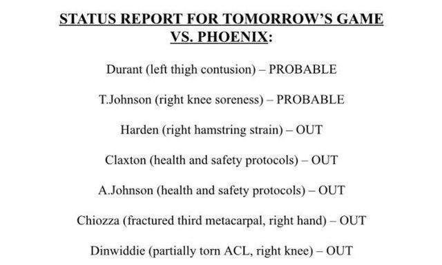 篮网官宣!杜兰特大概率明天复出战太阳,哈登等5人将继续缺阵