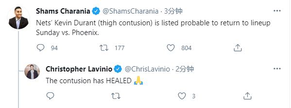 此前杜兰特被列为可能复出对阵凯尔特人(50%可能性),但篮网对决绿军当天,篮网宣布杜兰特休战,纳什给出的理由是杜兰特的伤势还没100%痊愈;如今杜兰特已被列为大概率出战(75%可能性),出战状态再次升级,对此名记Christopher Lavinio表示杜兰特挫伤已痊愈。