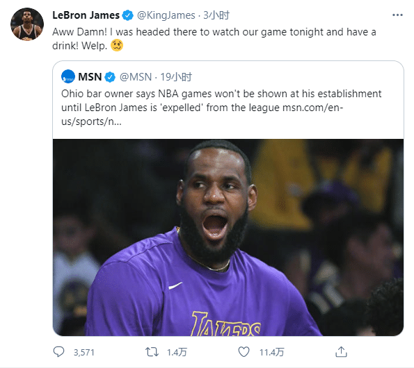 来源:24直播网04-25 16:3224直播网讯讯 此前俄亥俄州辛辛那提的酒吧老板呼吁联盟赶紧开除詹姆斯,否则就在酒吧内禁止播放NBA比赛;对此,湖人当家巨星勒布朗-詹姆斯已经公开回应酒店老板的言论;詹姆斯转发这一言论,发推写道:真该死!我本想今晚就去那里喝一杯,然后看我们的比赛呢!