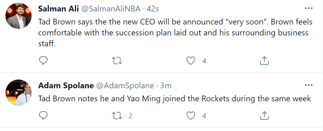 泰德-布朗在新闻发布会上提到和姚明的渊源,他透露自己和姚明是同一周加入火箭。火箭的老球迷应该对这位CEO很有印象,他曾多次和姚明一起参加活动,姚明将他视为良师益友。火箭跟队记者Jackson Gatlin感慨:“一个时代的终结。“