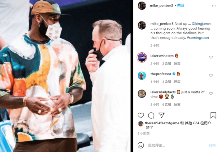 来源:24直播网04-24 11:4924直播网讯讯 浓眉复出之后又有好消息,勒布朗-詹姆斯即将复出,据湖人投篮教练Mike Penberthy 透露,他更新社交媒体,晒合影并且写道:湖人队下一个复出的是詹姆斯,很快回归,在场边听到他的复出想法总是很好的,这已经够久了。