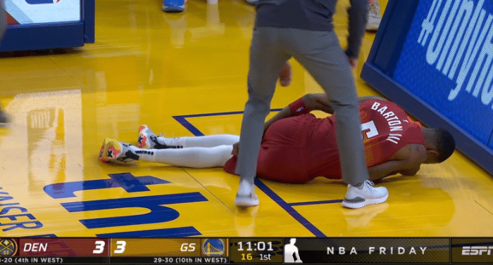 悲剧啊,威尔-巴顿是掘金首发后卫,可是对阵勇士,巴顿仅仅只打59秒就受伤离场,一瘸一拐坐回更衣室;从现场画面来看,巴顿有可能是大腿后侧受伤,目前他已经返回更衣室,接受检查,但愿巴顿伤势无大碍。