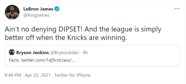 来源:24直播网04-23 15:2824直播网讯讯 北京时间4月23日,湖人球星勒布朗-詹姆斯更新社媒,转发了美国说唱团体Dipset在尼克斯主场的一段说唱,并写道:“不可否认,尼克斯赢球让联盟变得更好。”尼克斯目前已经拿下8连胜,以33胜27负的战绩排名东部第四,8连胜中包括以111-96的比分主场击败湖人。