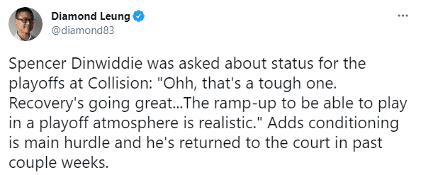 杜兰特即将复出,预计哈登将在常规赛最后几场或者季后赛之前复出,更要说的是丁威迪也可能在季后赛复出;据NBA记者Diamond Leung报道,丁威迪表示他恢复得很好,能够在季后赛上场是现实的,他还补充说现在体能训练是主要的障碍,在过去的几周他已经回到了球场。
